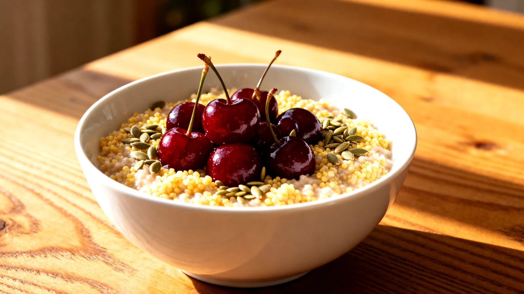 Im Hirseflockenbrei entfalten die gefrorenen oder frischen Sauerkirschen ihre Wirkung optimal. Wichtig ist nur, dass sie ungesüßt verwendet werden, um den Insulinspiegel vor dem Schlafengehen nicht unnötig zu belasten. Ein weiterer Vorteil von Sauerkirschen, der sie von Süßkirschen unterscheidet: Sie enthalten natürliches Melatonin, das Schlafhormon. Ernährungsberater empfehlen daher diesen Brei besonders für den Abend, idealerweise ein bis zwei Stunden vor dem Zubettgehen. Der erholsame Schlaf, der dadurch gefördert werden kann, ist wiederum eine wichtige Phase für die Muskelregeneration und den Aufbau neuer Strukturen.